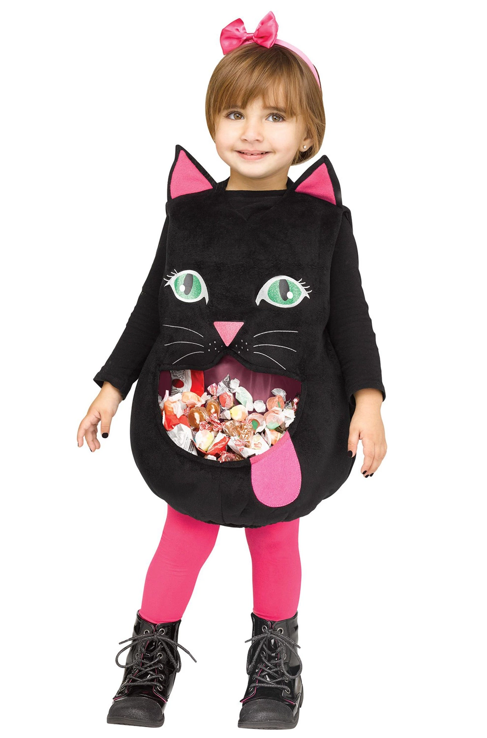 Teach your toddler to trick or treat in style with this Candy Collector Kitten Toddler Costume. This fun kitten costume features a bulbous tunic with an adorable cat face on it. The mouth of the cat also acts as the perfect place to store your little ones treats this Halloween!